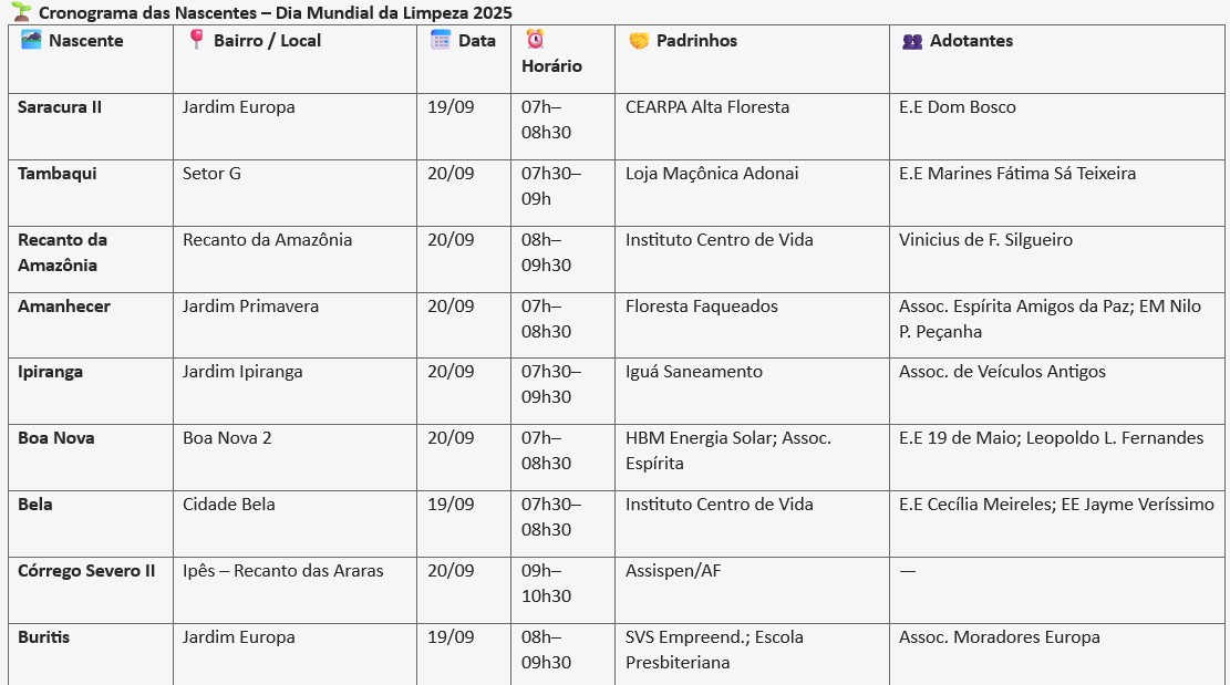 Em referência ao Dia Mundial da Limpeza, celebrado no próximo dia 20 de setembro, o município de Alta Floresta prepara uma grande mobilização ambiental por meio do programa “Adote uma Nascente”. A ação consistirá em um mutirão de limpeza das nascentes, que irá abranger 23 áreas distintas do município, reunindo mais de 50 entidades que são as protagonistas entre escolas, empresas, associações, produtores rurais, instituições públicas e organizações da sociedade civil.